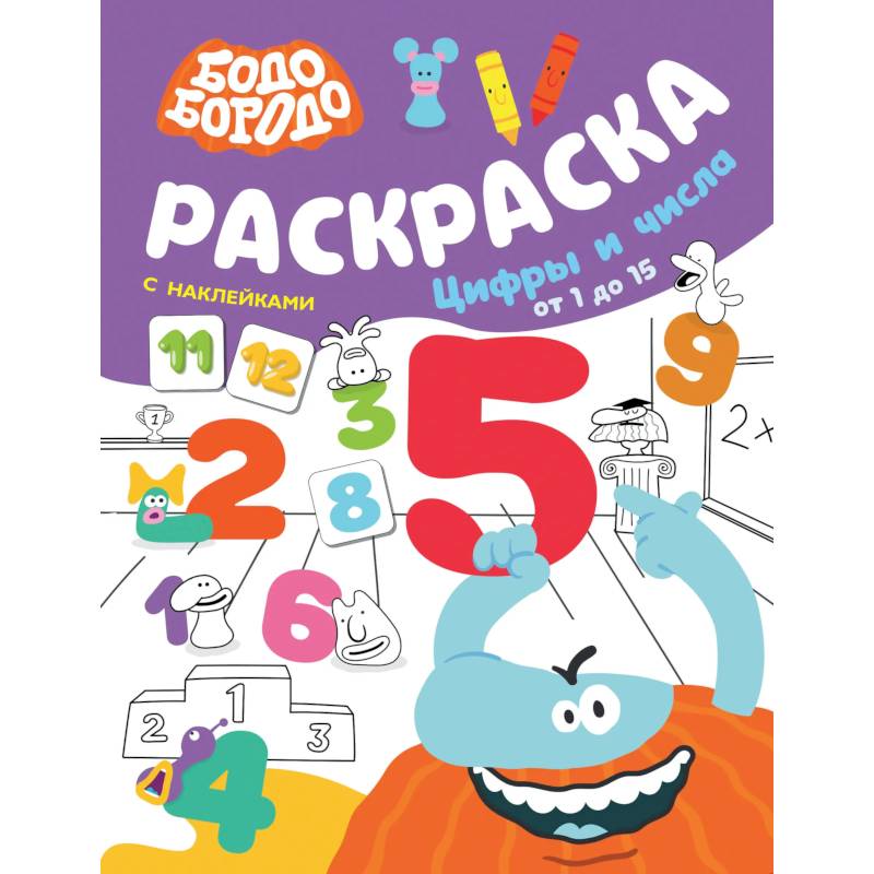 Бодо Бородо. Раскраска с наклейками. Цифры и числа от 1 до 15
