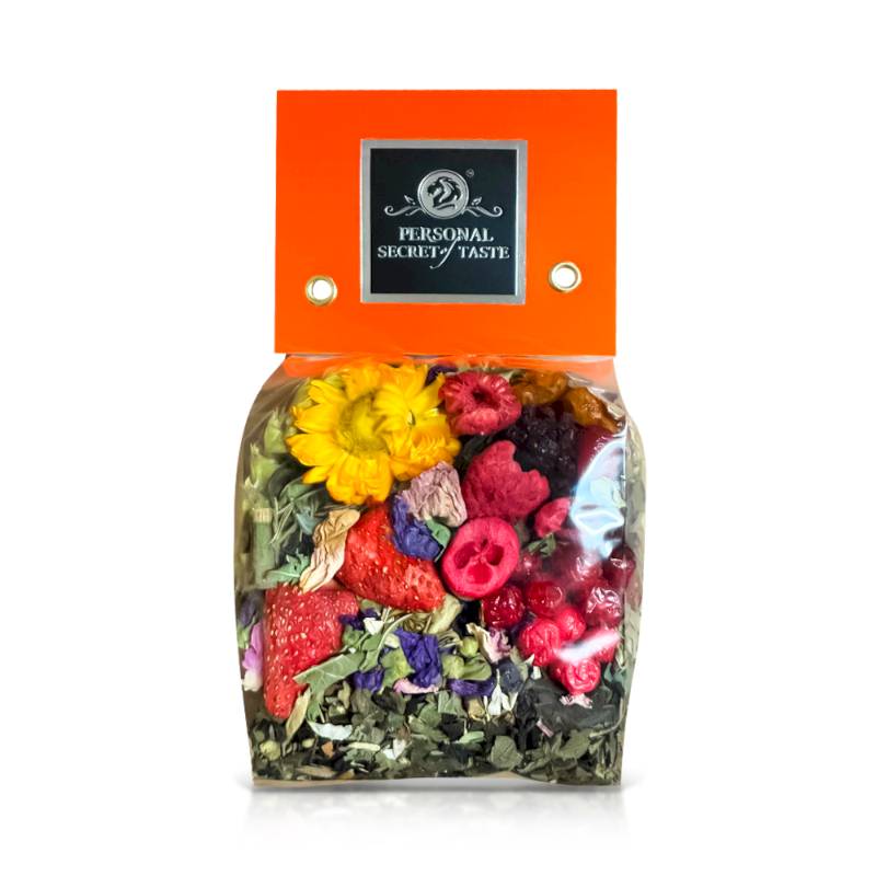 Состав : черный чай байховый крупнолистовой, лист ежевики, мелисса, душица, чабрец, цветки лимонника, чайная роза, вербена, василек, клевер, лист земляники, ягоды земляники, ягоды малины, ягоды ежевики, рябина, черноплодная рябина, ягоды красной смородины.