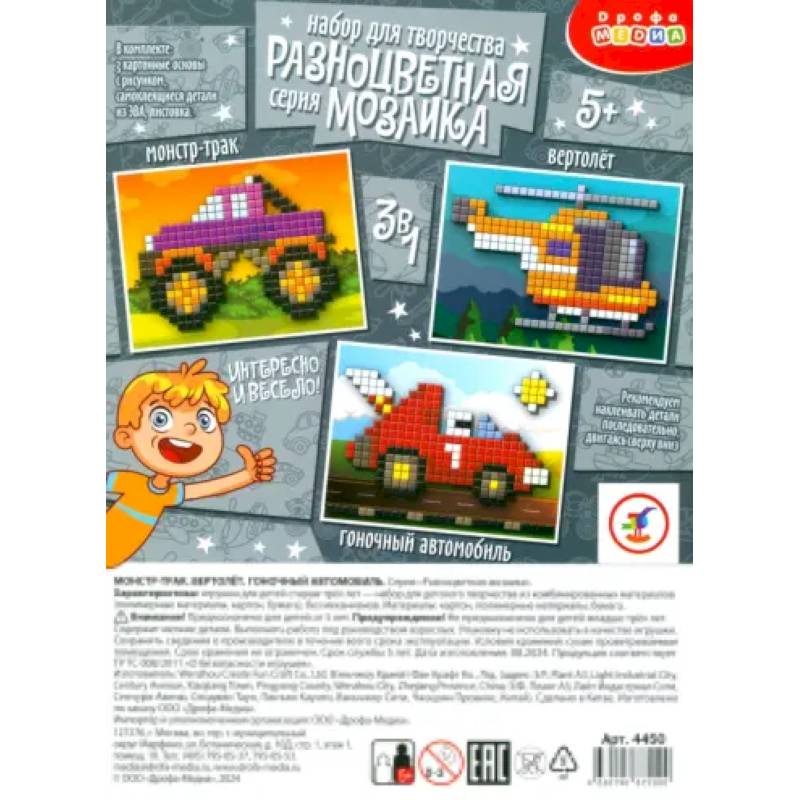 Набор для творчества от Дрофы Медиа "Монстр-трак. Вертолёт. Гоночный автомобиль" обязательно понравится мальчикам! Это набор разноцветных мозаик, в котором три картинки: могучий монстр-трак, транспортный вертолёт и быстрый гоночный автомобиль.