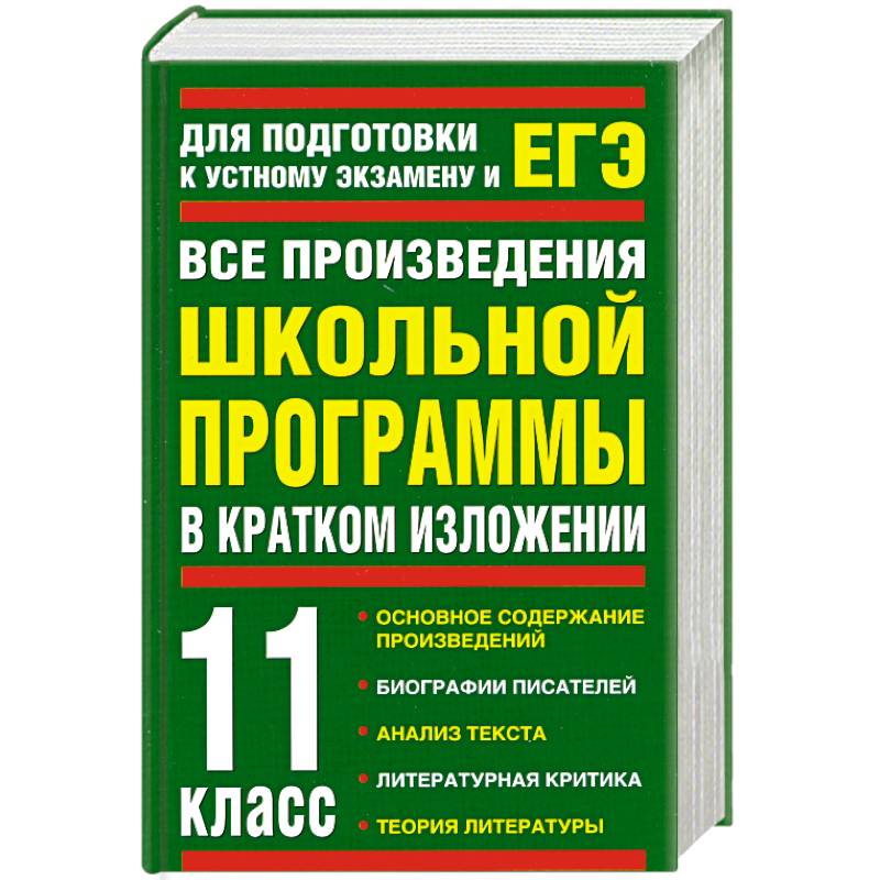В книгу вошли все произведения школьной программы по литературе за 11 класс.Пособие содержит краткое содержание самих произведений (как отечественных, так и зарубежных авторов), отрывки из критических статей, биографические сведения об авторах, анализ текста и справочные материалы по теории литературы.