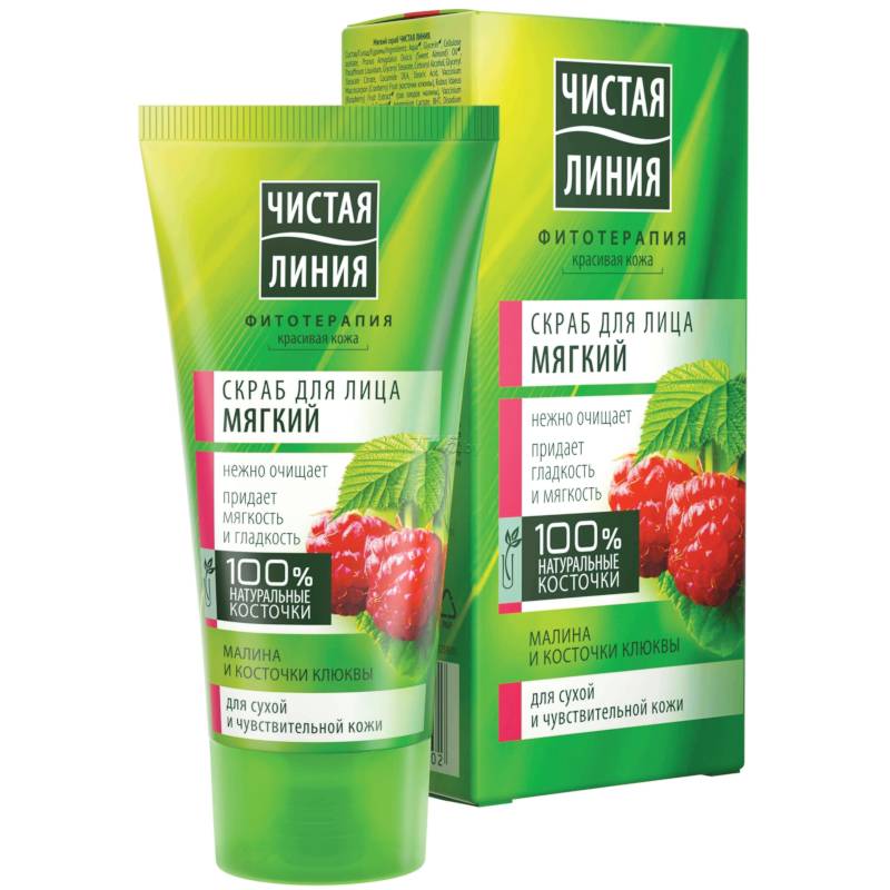 Представленный продукт обогащен экстрактом плодов малины и косточек клюквы. Эти ингредиенты обладают потрясающим зарядом витаминов. Скраб мягко и бережно очищает дерму от загрязнений, микробов и токсинов, улучшает гладкость и нежность кожного покрова, выравнивает оттенок лица и придает ему более свежее, насыщенное сияние. Скраб Чистая линия входит в коллекцию полностью натуральной косметики, поэтому абсолютно безопасен, и даже рекомендован для сухой и чувствительной кожи
