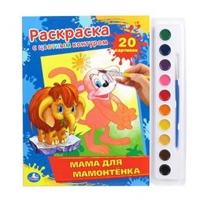 Раскраска "Мама для Мамонтёнка" с цветным контуром и красками для детей старше 3 лет.