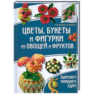 Свежие идеи для изготовления и украшения блюд! Астры, гвоздика, колокольчик, лилии, маки, маргаритки, одуванчики, пионы, розы, хризантемы, тюльпаны, фиалки - вы сможете вырезать из овощей и фруктов практически любой цветок или даже целый букет и поместить его в вазу из дыни или тыквы. А забавные фигурки животных - динозавр, заяц, белочка, птичка, обезьянка - из обычных овощей и фруктов помогут сделать незабываемым детский праздник или семейную трапезу. Все, что нужно, - это нарезать и уложить необходимые продукты в соответствии с пошаговыми инструкциями и красочными фотографиями.