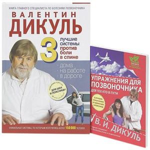 Книга 1 3 лучшие системы от боли в спине Легендарный Валентин Дикуль - самый известный специалист по болезням позвоночника. Сотни тысяч пациентов по всему миру получили исцеление по его методикам. Первая книга В.И.Дикуля вдохновила десятки тысяч людей разного возраста всерьез заняться своим позвоночником. У каждого из них - своя боль в спине. Как от нее избавиться? Академик Дикуль разработал системы упражнения от боли в шее и пояснице и сам лично представляет их на страницах второй книги. Выбрав нужную систему и следуя ей, городской житель может не бояться, что здоровью его спины повредят автомобильные пробки, компьютерные бдения или загруженность малоподвижной работой. Воспользуйтесь уникальной возможностью обрести здоровую спину по рекомендациям самого авторитетного специалиста! Твердый переплет Книга 2 Упражнения для позвоночника для тех, кто в пути Регулярный уход за любимым авто гораздо лучше стихийного бедствия капремонта. Цена вопроса возрастает в десятки раз, когда речь идет о вашем здоровье. С больной спиной или шеей далеко не уедешь! Академик В.И.Дикуль, лучший специалист по здоровью позвоночника, разработал специальные системы упражнений для всех путешественников. На суше и в воздухе, в любой длинной поездке эти упражнения сохранят здоровье вашей спины. Простые лечебные движения в этой книге представляет сам Валентин Иванович. Некоторые упражнения можно выполнять даже стоя в пробке, не выходя из машины. Прислушайтесь к авторитетной рекомендации! Пусть ничто не мешает свободе движения! Мягкая обложка
