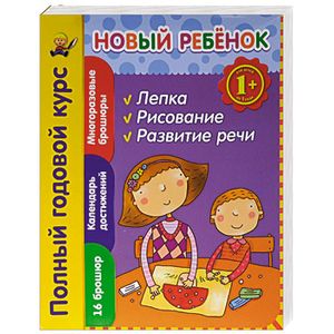 Учебно-развивающий комплект для занятий с ребенком в течение года включает в себя 16 брошюр. В каждой коробке вы также найдете календарь достижений малыша. В комплект входят брошюры по 3-м направлениям развития: развитие речи, рисование, лепка. Полный годовой курс поможет научить малыша всему, что нужно знать и уметь. Не надо обладать специальным знаниями, не надо обращаться к специалистам, не надо искать множество пособий - достаточно купить комплект "Новый ребёнок. Полный годовой курс 1+", и он поможет родителям организовывать занятия, а малышам - учиться с интересом.