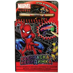 Страницы этой удивительной раскраски покрыты особым чёрным слоем, под которым скрываются цветные портреты героев Marvel. Часть портретов нарисована на золотой фольге. Стереть верхний черный слой и проявить спрятанные картинки поможет специальный стилус. А ещё в книге есть весёлые суперзадания и головоломки.