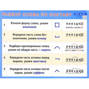 На красочно оформленном плакате в доступной форме представлен алгоритм разбора слова по составу. Предлагаемый плакат является самостоятельной частью Комплекта наглядных пособий по русскому языку для начальной школы.