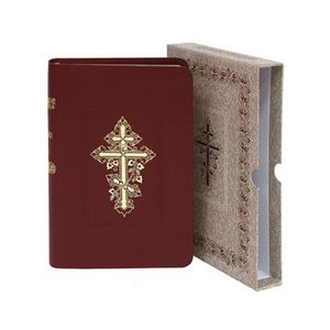 Стильно оформленное подарочное издание в футляре. Кожаный переплет с золотым тиснением на обложке и двумя шелковыми ляссе. Книга с трехсторонним золотым обрезом и индексами по обрезу для быстрого поиска библейских книг.