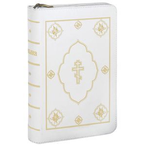Стильно оформленное подарочное издание в гибком кожаном переплете на молнии, с трехсторонним золотым обрезом и индексами для поиска библейских книг и шелковым ляссе.