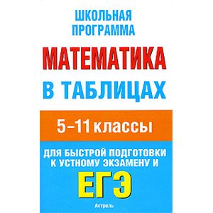 Справочный материал по всему школьному курсу математики в 5-11 классах сгруппирован в тематические таблицы. Весь материал распределен в соответствии с содержанием школьных предметов - математика, алгебра, геометрия - по разделам, адресованным школьникам 5-6 классов, 7-9 и 10-11.