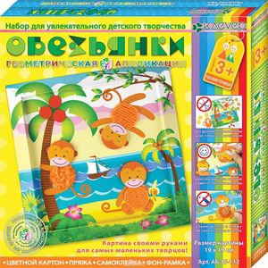Набор для изготовления картины "Обезьянки" является не только замечательным подарком, но и увлекательным методическим пособием, развивающим способности ребёнка младшего дошкольного возраста. Малыш знакомится с разными по фактуре материалами и геометрическими фигурами, учится склеивать из частей целое. Интересный сюжет картинки помогает ребёнку рассказывать, какие фигуры он использует, какого цвета эти фигуры, какое изображение у него получается.