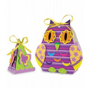 Набор для декорирования двух коробочек "Совушка". Даже самый небольшой подарок становится приятней и интересней, если он красиво упакован. Давайте сделаем две ярких коробочки: одну побольше с забавной совой, с карточкой для поздравления, и вторую поменьше, она называется бонбоньерка. Ребёнку от 5-ти лет будет несложно сделать стильные коробочки, ведь их изготовление превращается в игру. Все картонные детали коробочек готовы, - их только нужно вынуть из основы и склеить; бумажные детали несложных форм - их легко вырезать и наклеить на детали коробочек с помощью двусторонней клеящейся ленты вместо клея. Бант из ленты скрепит стороны коробочки и украсит её макушку - работа над набором будет приятна и вам, и ребёнку.
