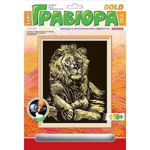 Гравюра "Лев" с металлическим эффектом "под золото" содержит в комплекте основу с нанесенным контуром, специальный штихель и инструкцию. Контур изображения уже нанесен на черный фон. С помощью специального штихеля изображение процарапывается по контуру, и из-под слоя краски появляется золотистая основа. В результате получается контрастный рисунок с эффектным изображением. Несложный и занимательный процесс создания гравюры не только принесет удовольствие ребенку, но и даст возможность развивать творческие способности, фантазию и внимательность, а получившееся изображение льва станет достойным украшением или подарком на любой праздник.