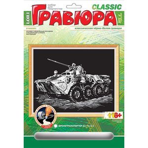 Классическая гравюра Lori "Бронетранспортер" содержит в комплекте белую основу с нанесенным на черный фон контуром, специальный штихель и инструкцию на русском языке.