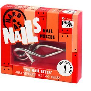Серия Хитрые гвозди (Nail Puzzles) объединяет головоломки из гвоздей, упакованные в яркие коробочки. Просто разделите два гвоздя! Головоломка Гнутый гвоздь (арт. 1013, The Nail Biter) имеет 1 уровень сложности из 5 возможных.