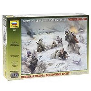 Набор миниатюр "Немецкая пехота. Восточный фронт. Зима 1941-1942" включает в себя элементы для сборки четырех миниатюр пехотинцев вермахта, экипированных на зимний период 1941-1942 годов, вооруженных пистолетом-пулеметом МР-38 и карабинами 98к. Один из пехотинцев переносит боекомплект для 50-мм миномета.