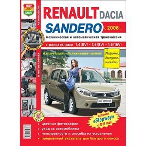 Цветное справочно-информационное издание Руководство по ремонту Рено Сандеро, Дача Сандеро, а также руководство по эксплуатации и техническому обслуживанию, устройство Renault Sandero / Dacia Sandero, с 2008 г. выпуска, оснащенных автоматической и механической трансмиссией и оборудованных бензиновыми двигателями рабочим объемом 1,4 (8V) и 1,6 л. (8V и 16V). Также рассмотрена модель Renault Sandero Stepway с 2011 г. выпуска.