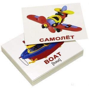 Дорожный набор из 40 двусторонних карточек с подписями на английском языке и транскрипциями. На обороте - те же картинки с подписями на русском языке.