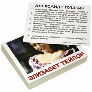 Он включает в себя 40 карточек. С одной стороны карточки изображение выдающейся личности, а на обратной стороне задания и факты связанные с этим человеком. Просмотр таких карточек позволяет ребёнку быстро усвоить тему "выдающиеся личности", запомнить, как пишутся слова, развивает у него интеллект и формирует фотографическую память.