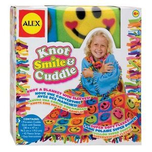 "Собирается" с помощью завязывания бахромы в узелки. Маленькая мастерица сама изготовит себе яркий оригинальный плед с рукавами! Так забавно и уютно! Накрываешься пледом, продеваешь руки в рукава и уютно и тепло и можно вертеться, не боясь, что плед свалится.