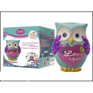 В наборе: керамическая копилка с нанесенным контуром рисунка, краски для керамики и кисть.