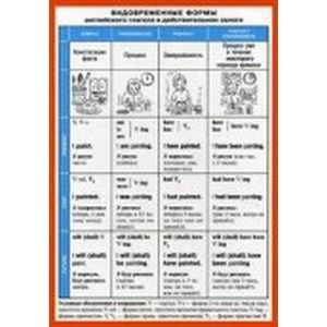 Наглядно-раздаточное пособие содержит таблицу видовременных форм английского глагола в действительном залоге. Дополнительно приведены формы неправильных глаголов.