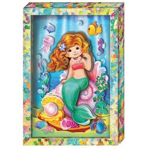 Дети от 5 лет легко подберут готовые детали (ножницы не понадобятся), а объёмный скотч для послойного наклеивания создаст эффект диарамы в глубокой готовой рамке. Русалочка- любимый всеми детьми персонаж, особенно её любят девочки. Красавица присела отдохнуть на морском дне, а вокруг вьются яркие рыбки.