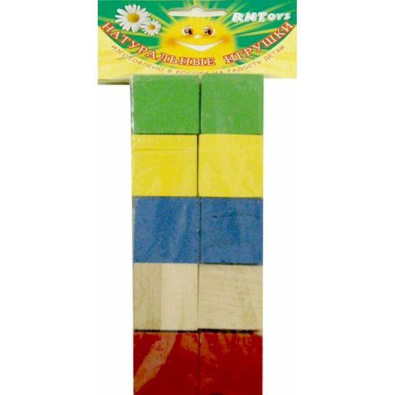 В набор входят 10 классических деревянных кубиков: 2 красных, 2 синих, 2 зеленых, 2 желтых и 2 неокрашенных.