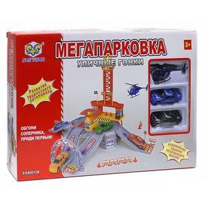 В комплект входят: 2 металлические машинки, металлический вертолет, дорожные знаки, рекламные щиты.