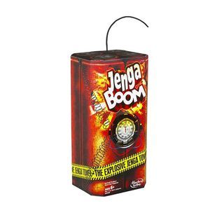 Настольная игра "Дженга Бум" позволит вам и вашему ребенку весело провести время в кругу друзей или семьи. На платформе с детонатором выстраивается башня из деревянных брусочков. Перед этим необходимо вытянуть веревку детонатора до упора, поднять платформу и выложить все бруски на платформу по три в ряд. Во время своего хода игрок должен нажать на кнопку со стрелкой, чтобы активировать детонатор. Затем одной рукой вынуть брусок из любого уровня и положить его наверх башни и нажать на кнопку с квадратиком. Если башня взорвалась - вы проиграли. Последний игрок, который сможет поставить брусок и остановить детонатор до того, как башня взорвется, становится победителем.