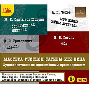 Послушайте аудиоспектакли, поставленные по сатирическим произведениям выдающихся русских писателей XIX века. В сборнике представлены: Николай Васильевич Гоголь (1809-1852) - повестью "Нос". Дмитрий Васильевич Григорович (1822-1899) - рассказом "Бобыль", Михаил Ефграфович Салтыков-Щедрин (1826-1889) - романом "Современная идиллия", Антон Павлович Чехов (1860-1904) - пародийными повествованиями "Мои жёны" и "Жены артистов".