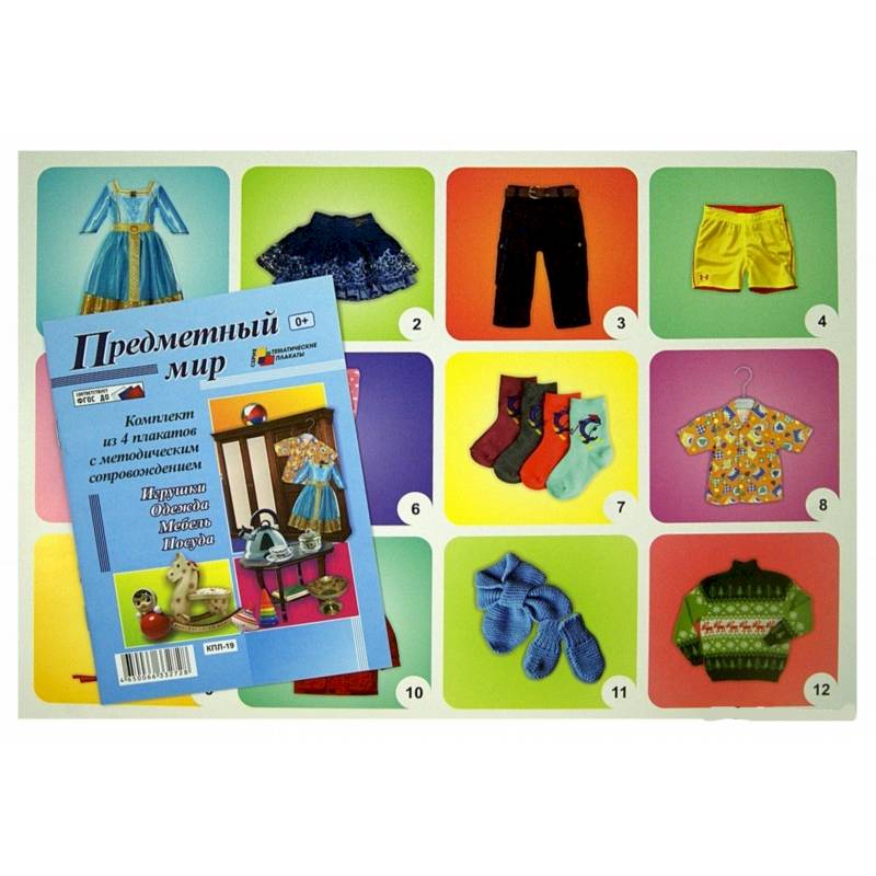 Комплект из 4 плакатов "Предметный мир" ("Игрушки", "Одежда", "Мебель", "Посуда") с методическим сопровождением.