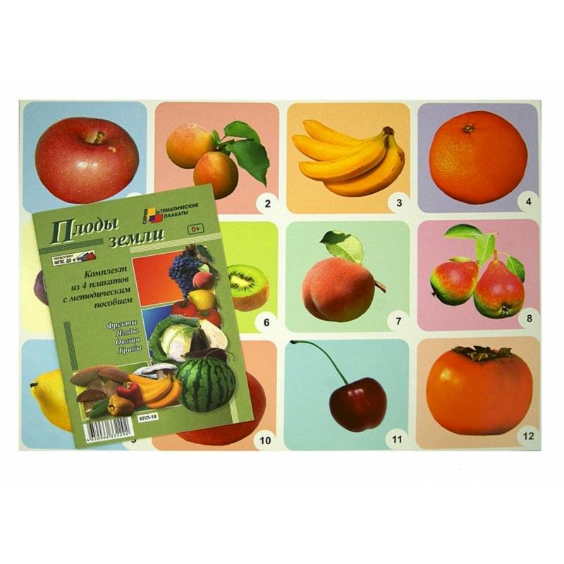 Комплект из 4 плакатов "Плоды земли" ("Фрукты", "Ягоды", "Овощи", "Грибы") с методическим сопровождением).