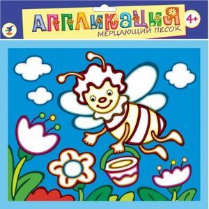 В комплекте: цветная основа с контуром рисунка и клеевым слоем, 6 пакетиков цветных блесток, кисточка, деревянная палочка.