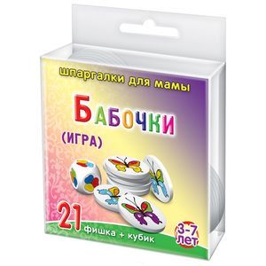 В наборе кубик с тремя цветами на каждой стороне + 21 акриловая фишка (экологически чистые) с изображениями трёхцветных бабочек.