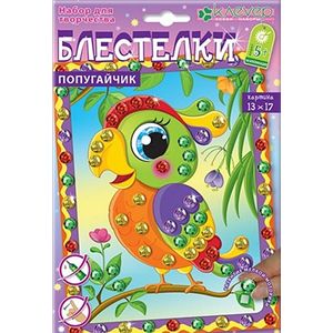Разноцветный попугайчик красуется и поёт среди экзотических цветов в пышных кронах южных деревьев. Мини-картины серии "Блестелки" - первые шаги ребёнка старше 5 лет в освоении интересной и красочной техники мозаики. Это самый простой пример мозаики - не сплошное составление картины из мелких элементов, а декорирование её отдельных частей. Украсьте картину разноцветными искрящимися пайетками! Без клея - аккуратно и чисто!