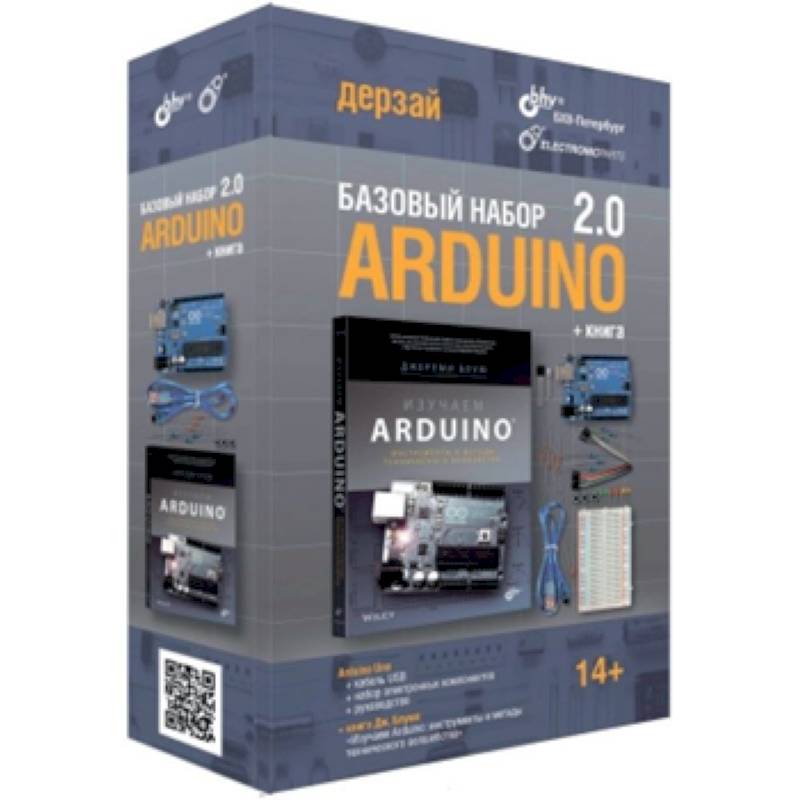 В него входит популярная книга Джереми Блюма "Изучаем Arduino: инструменты и методы технического волшебства" , плата Arduino Uno с кабелем для подключения к ПК, макетная плата, электронные компоненты и брошюра с упражнениями.