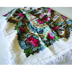 Павловопосадские платки — замечательный подарок, который никогда не выходит из моды. Они пленяют своей мягкостью, дарят уют в прохладное время года. Русские платки с изысканными узорами, украшенные сказочными цветами, станут памятным подарком для близких людей. Особенно ценят подобные головные уборы гости иностранцы. Их пленяет русский национальный колорит и душевное тепло, воплощенные в изделиях народного промысла. Павлопосадский платок с шелковой бахромой 120х120 см , белый. Состав: 50%- шерсть, 50%- природное волокно