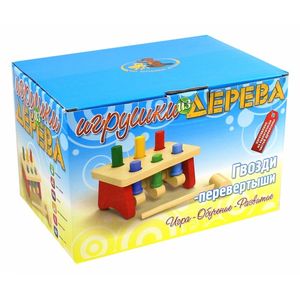 Игрушка "Гвозди-перевертыши" состоит из столика-основы, с четырьмя ножками (две снизу и две сверху), "гвоздей" и молоточка. Все детали игрушки имеют округлые края и сделаны из дерева. Столик имеет 8 отверстий, куда плотно вставлены гвоздики - цилиндрики диаметром 1,5см. Гвозди попарно окрашены в основные цвета. Надо заколотить молоточком гвозди, затем перевернуть столик и проделать операцию заново. Гвозди-перевертыши - игра не только увлекательная, но и очень полезная. Она развивает координацию движений и мышечную ловкость, снимает агрессию и избыточную активность. заколотить деревянные гвозди, затем перевернуть основу и можно снова забивать гвозди. Заколачивать гвозди не так-то просто, нужно четко попадать по ним молоточком. Поэтому на начальном этапе знакомства со стучалками лучше использовать более простую модель. Например, стучалку "шарики". Гвозди-перевертыши упакованы в картонную коробку. В комплекте: - столик-основа; - 8 гвоздей; - молоточек. Размер: 78ммX270ммX130мм.