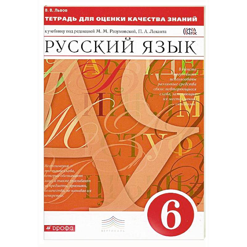 Тетрадь к учебнику под редакцией М. М. Разумовской, П. А. Леканта, в том числе к переработанному по ФГОС, содержит разнообразные задания, соответствующие учебной программе по русскому языку для 6 класса. Они направлены на проверку теоретических знаний и практических умений школьников. Тетрадь предназначена для проведения на уроках текущего и итогового контроля по основным темам курса.