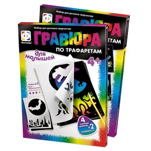 В набор входит: комплект основ для гравюр, трафареты, скрепки, стик-скребок.