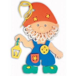 Игры-шнуровки являются одним из самых эффективных способов совершенствования мелкой моторики ребёнка, в игровой форме развивают у него память, воображение, цветовосприятие, пространственное и логическое мышление. Игрушка изготовлена из мягкого вспененного полимера. При выполнении узоров следует обращать внимание ребёнка на количество линий в рисунке, на размер линий (длинная, короче, самая короткая), на их направление (горизонтально, вертикально или по диагонали) и на их расположение на поле (справа, слева, вверху, внизу). Можно рассказать ребёнку о простейших геометрических фигурах, изображая их шнурками: прямая, отрезок, ломаная линия, угол, треугольник, квадрат, прямоугольник, многоугольник. А потом вместе собрать забавного гномика с фонариком в руках - в башмачках, комбинезоне, колпачке, с бородкой из шнурка.