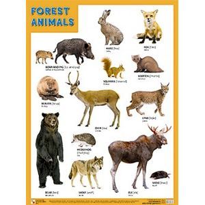 Плакат большого формата «FOREST ANIMALS» поможет детям в изучении английского языка. С его помощью они легко освоят новые слова по теме «Лесные обитатели» и запомнят названия животных: медведь, белка, еж и др.