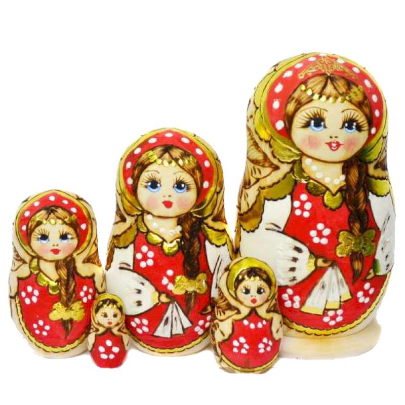 5-кукольная Матрешка - старинная русская игрушка из дерева в виде куклы. Внутри нее находятся еще матрешки подобные ей, только меньшего размера. В нее с удовольствием играли дети даже в далёком прошлом.