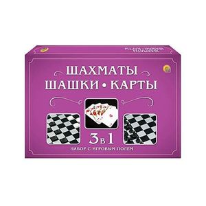 Состав набора: игровое поле - 28,5х28,5 см, шахматы - 32 штуки (16 черных, 16 белых), шашки - 24 штуки (12 черных, 12 белых), карты игральные - 36 штук.