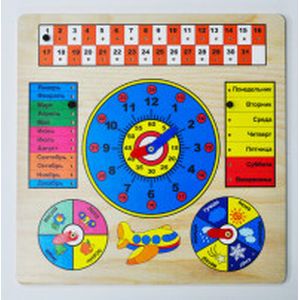 Развивающая игрушка "Календарь с часами" познакомит ребенка с календарем, временами года, позволит развить мелкую моторику, научит основам классификации. Обучающая доска «Календарь с часами» представляет собой картинку с движущимися стрелками в направляющих пазах. Чтобы получить нужное время на часах или нужный сезон, просто установите стрелки на соответствующее положение в круге, а чтобы выбрать нужный месяц или погоду, переместите стрелку в пазу в нужном направлении.