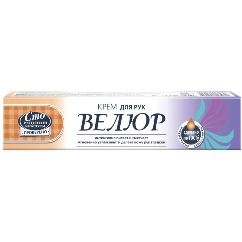 Крем для рук «ВЕЛЮР» - это уход за кожей рук со специально подобранными компонентами. Глицерин, витамин F и экстракт ромашки в сочетании с компонентами крема устраняют чувство стянутости, сухость и шелушение, придают ей гладкость, улучшают защитную функцию кожи.