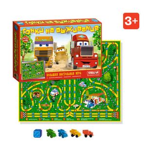 В комплект входят игровое поле, 7 фишек-автомобиля и игральный кубик.