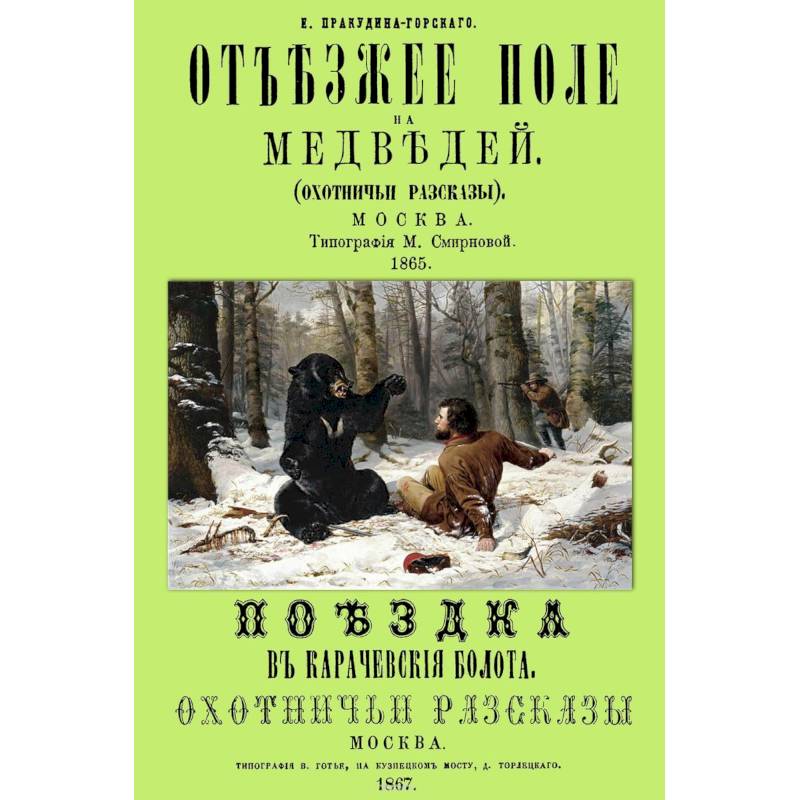 Репринт с издания. Москва 1865. Пракудин-Горский Егор Сергеевич. По профессии - лесничий (город Покров Владимирской губернии). Много работал в литературе, был одним из самых деятельных сотрудников первого русского "Журнала охоты" Г. Мина. В этом журнале печатались его рассказы: "Стрельба вальдшнепов на осеннем перепутье" (1858, № 7) "Осень и отъезжее поле" (1859, № 11), "Охота на медведя" (1862, № 4), "Иван Петрович и его наблюдатели" (1862, № 5). Автор книг: "Поездка в Карачевские болота" (М, 1867) и "Отъезжее поле на медведей" (М., 1865). Автор книги был близко знаком со многими знаменитыми охотниками и писателями России и неоднократно устраивал медвежьи охоты для Императора Александра II.