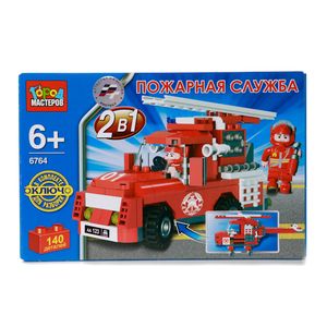 Конструктор состоит из 140 разноцветных деталей, которые при сборке образуют яркую пожарную машину с лестницей на крыше и мигалками.